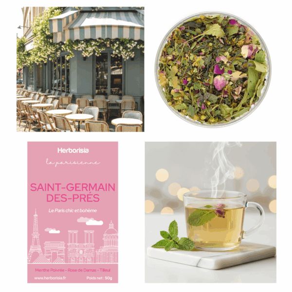 La tisane "Saint-Germain-des-Prés" marie la fraîcheur vivifiante de la Menthe Poivrée, la douceur florale de la Rose de Damas et les vertus apaisantes du Tilleul. Inspirée par l’esprit bohème et intellectuel du célèbre quartier parisien, cette infusion est un véritable voyage sensoriel, idéal pour apaiser l’esprit et réconforter le corps.